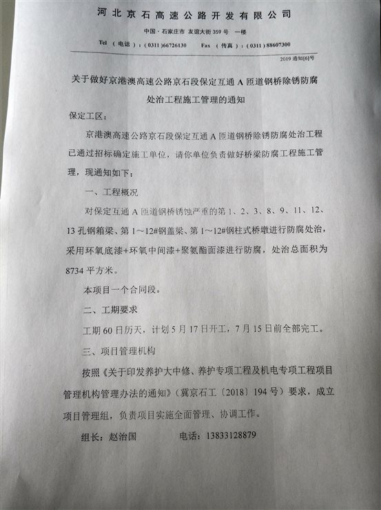 關(guān)于做好京港澳高速公路京石段保定互通A匝道鋼橋除銹防腐處治工程施工管理的通知