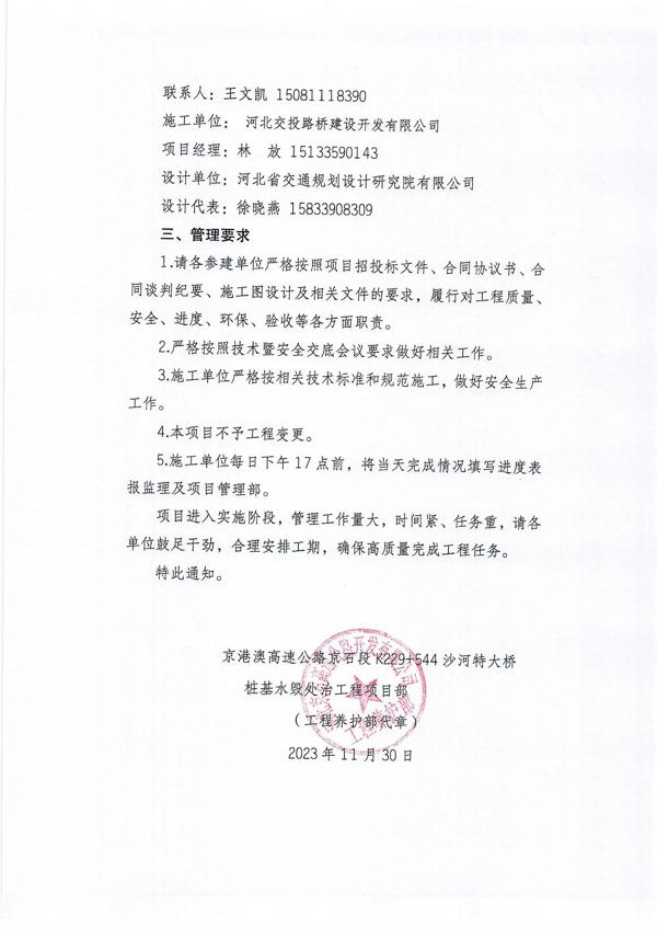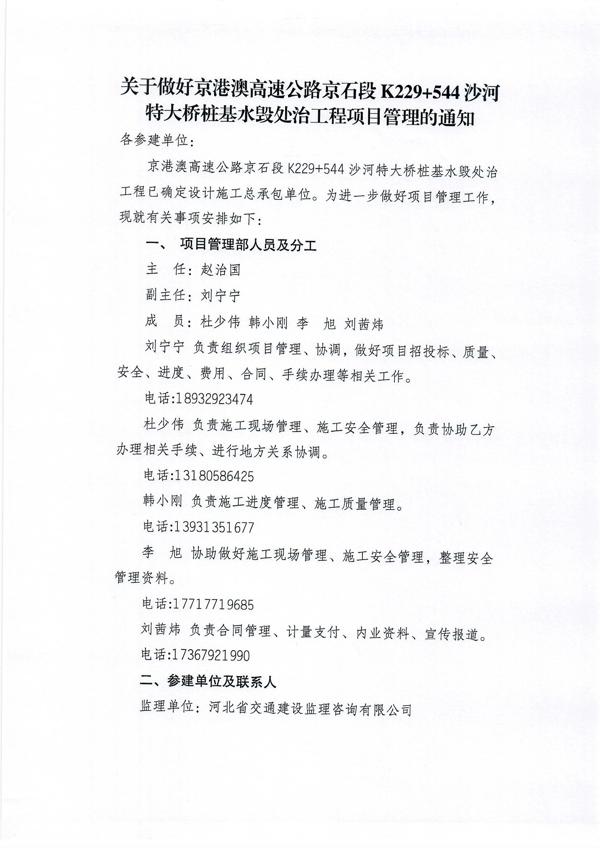 關(guān)于做好京港澳高速公路京石段K229+544沙河特大橋樁基水毀處治工程項(xiàng)目管理的通知