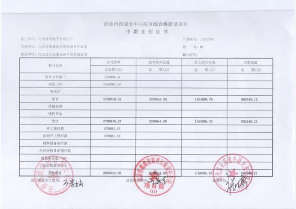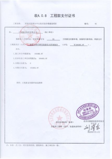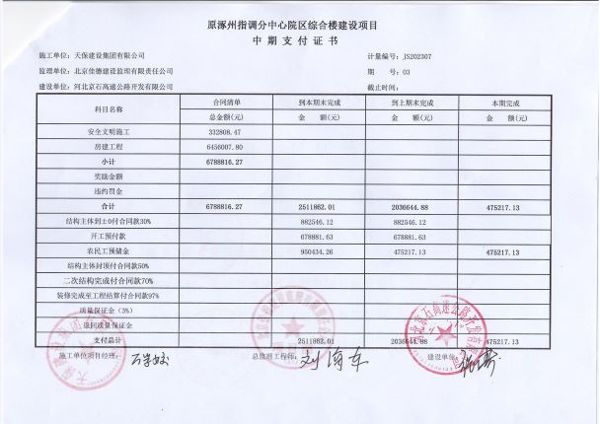 原涿州指調(diào)分中心院區(qū)綜合樓建設(shè)項目支付證書