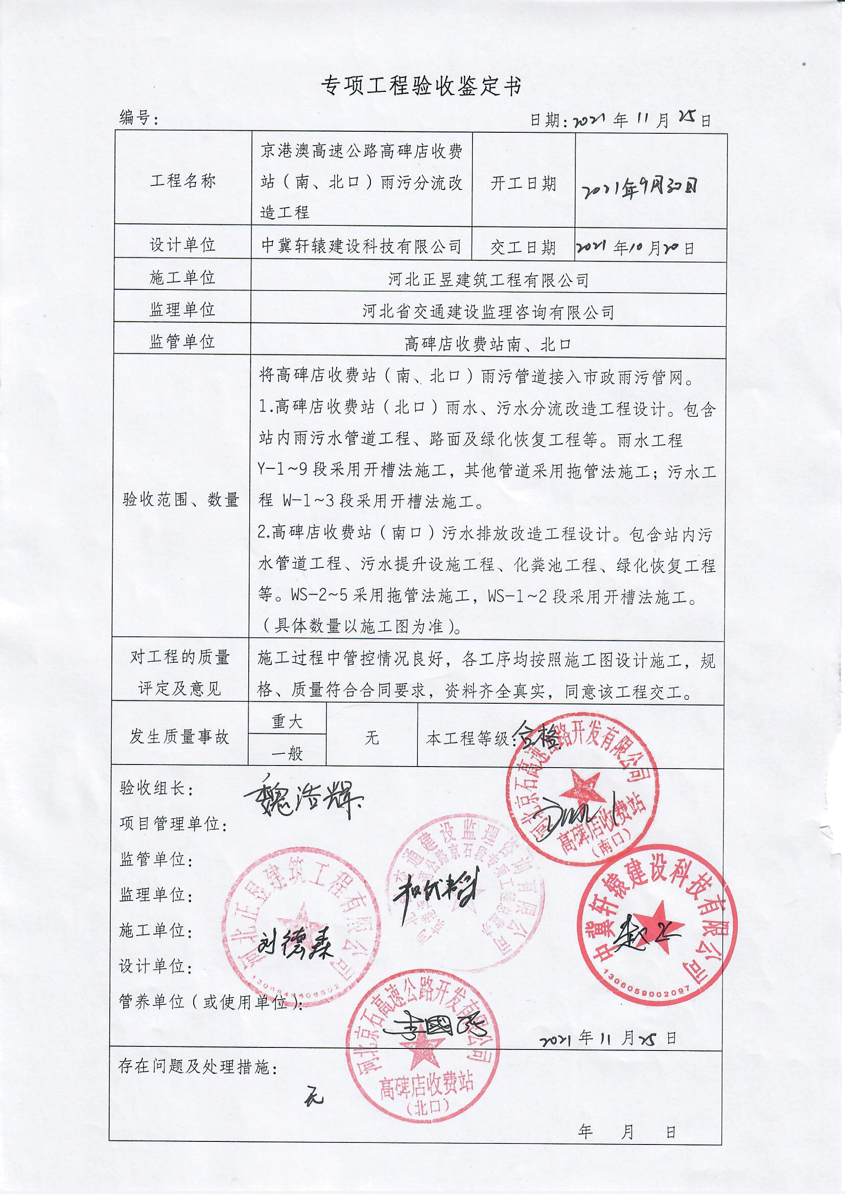 京港澳高速公路高碑店收費(fèi)站(南、北口)雨污分流改造工程驗(yàn)收單