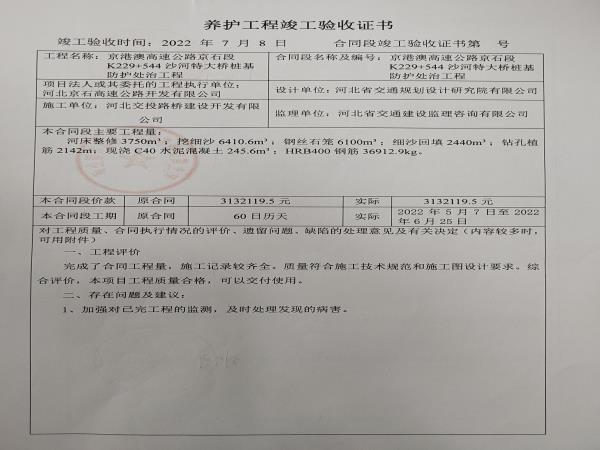 京港澳高速公路京石段沙河特大橋樁基防護(hù)處治工程驗(yàn)收證書