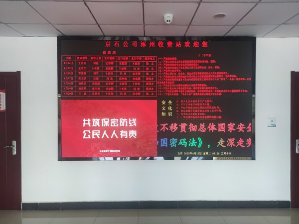 二是加強線下宣傳展示,提升公眾直觀認知。涿州站在辦公區(qū)、收費站張貼2張主題海報,利用電子顯示屏滾動播放保密公益宣傳片及國家安全宣傳口號,從早到晚不間斷。過往人員能直觀了解國家安全的重要性,有效擴大了宣傳覆蓋面與影響力。
