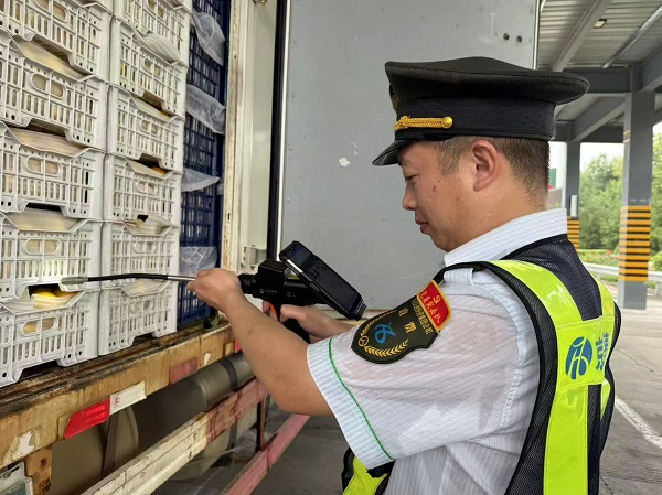 正午時(shí)分,收費(fèi)站廣場(chǎng)地表溫度直逼60℃,瀝青路面泛起微光。黨員們身著反光背心,手持查驗(yàn)終端,穿梭于一輛輛綠通貨車(chē)之間。掀開(kāi)篷布時(shí),撲面而來(lái)的熱浪裹挾著果蔬氣息,他們卻無(wú)暇擦拭額頭豆大的汗珠,仔細(xì)核對(duì)貨物品類(lèi)、查驗(yàn)裝載空間、拍攝留存影像。“夏季瓜果易腐壞,查驗(yàn)速度就是效率,更是民生溫度?!?/p>