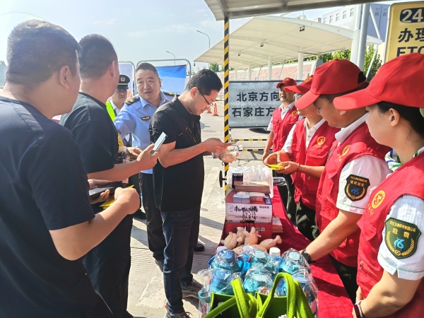 座談會(huì)后,雙方黨支部的黨員志愿者共同前往徐水收費(fèi)站外廣場,設(shè)立“雙節(jié)便民服務(wù)站”,以志愿服務(wù)踐行初心使命。黨員們佩戴黨徽、亮明身份,分工協(xié)作開展服務(wù):