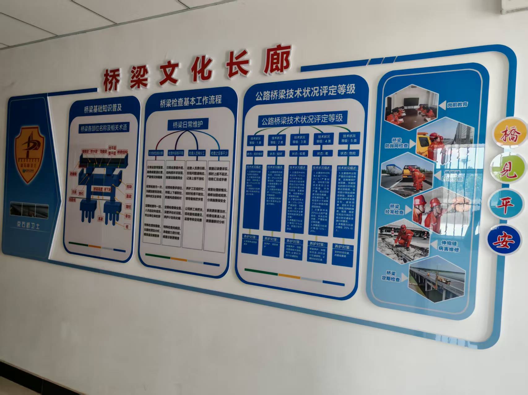 在經(jīng)歷前期室內(nèi)知識(shí)科普、橋梁現(xiàn)場(chǎng)實(shí)際教學(xué)后,為進(jìn)一步鞏固橋梁知識(shí)科普成果,橋梁科通過(guò)將橋梁各部位名稱及相關(guān)術(shù)語(yǔ)、橋梁檢查基本工作流程以及橋梁技術(shù)狀況評(píng)定等級(jí)等內(nèi)容結(jié)合橋梁示意圖在工區(qū)辦公樓一樓走廊內(nèi)進(jìn)行上墻展示。