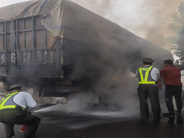 “老吳!快拿滅火器,有車著火了!”收費員邢毅對講機里喊道,只見他手拎滅火器立即向外廣場奔去。 10月4日上午10點40分左右,正值節(jié)假日出行車流高峰時段,在藁城北收費站出口外廣場與國道的交接處,一輛滿載煤炭的六軸重型貨車突然發(fā)生自燃。司機跑到收費站尋求幫助,收費員邢毅和吳國忠沒有一絲猶豫,迅速攜帶滅火器趕赴現(xiàn)場,在確保自身安全的前提下,對著火點展開滅火,為后續(xù)專業(yè)救援爭取寶貴時間。據(jù)司機描述,剛發(fā)現(xiàn)冒煙就趕緊停車查看,誰知停好車這火苗就竄起來了。