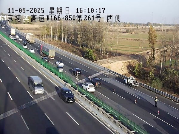 15時(shí)50分,在京石高速K166+850處,一輛大貨車因爆胎??啃熊嚨?。智慧調(diào)度中心的智能視頻監(jiān)測(cè)系統(tǒng)立即識(shí)別異常并自動(dòng)報(bào)警。監(jiān)控員接報(bào)后,迅速鎖定事件準(zhǔn)確位置,通過(guò)沿線情報(bào)板發(fā)布警示信息,并同步調(diào)度附近交警和救援車輛趕赴現(xiàn)場(chǎng)。