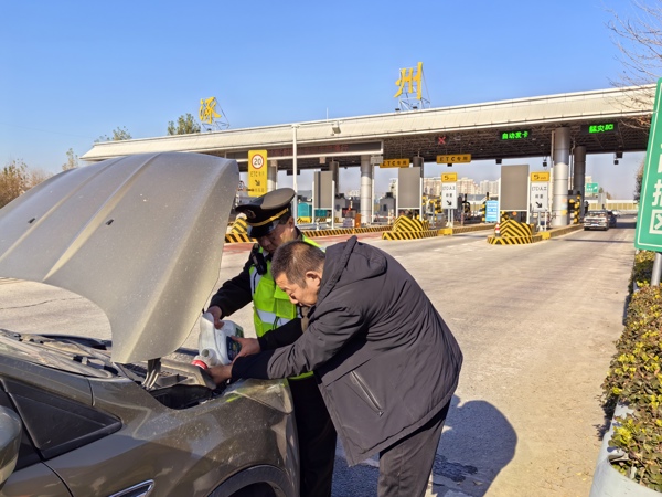 接到報告后,王松青沒有絲毫耽擱,第一時間來到故障車輛前。經(jīng)初步查看和與司機(jī)溝通,確認(rèn)車輛是因缺乏防凍液導(dǎo)致發(fā)動機(jī)“開鍋”,無法繼續(xù)行駛。面對司機(jī)焦急無奈的神情,王松青沉著安撫道:“您別著急,我們站的便民服務(wù)亭里備有常用的防凍液,我這就去給您取來?!?/p>
