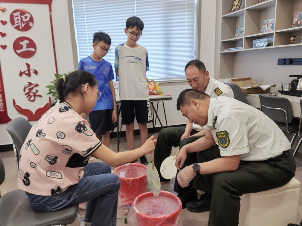 親子創(chuàng)作環(huán)節(jié)暖意涌動(dòng)。家長(zhǎng)與孩子并肩協(xié)作,一同調(diào)試漆色、輕漾水面、旋動(dòng)扇面。看色彩在水中暈染成靈動(dòng)的詩(shī),又在扇面上定格成獨(dú)有的景,孩子們眼中滿是驚喜。“爸爸,瞧我做的扇子!”此刻,手工創(chuàng)作的喜悅與紅色基因的傳承悄然相擁,家長(zhǎng)們?cè)谂惆橹兄販爻跣?,孩子們?cè)趯?shí)踐中埋下信仰的種子。
